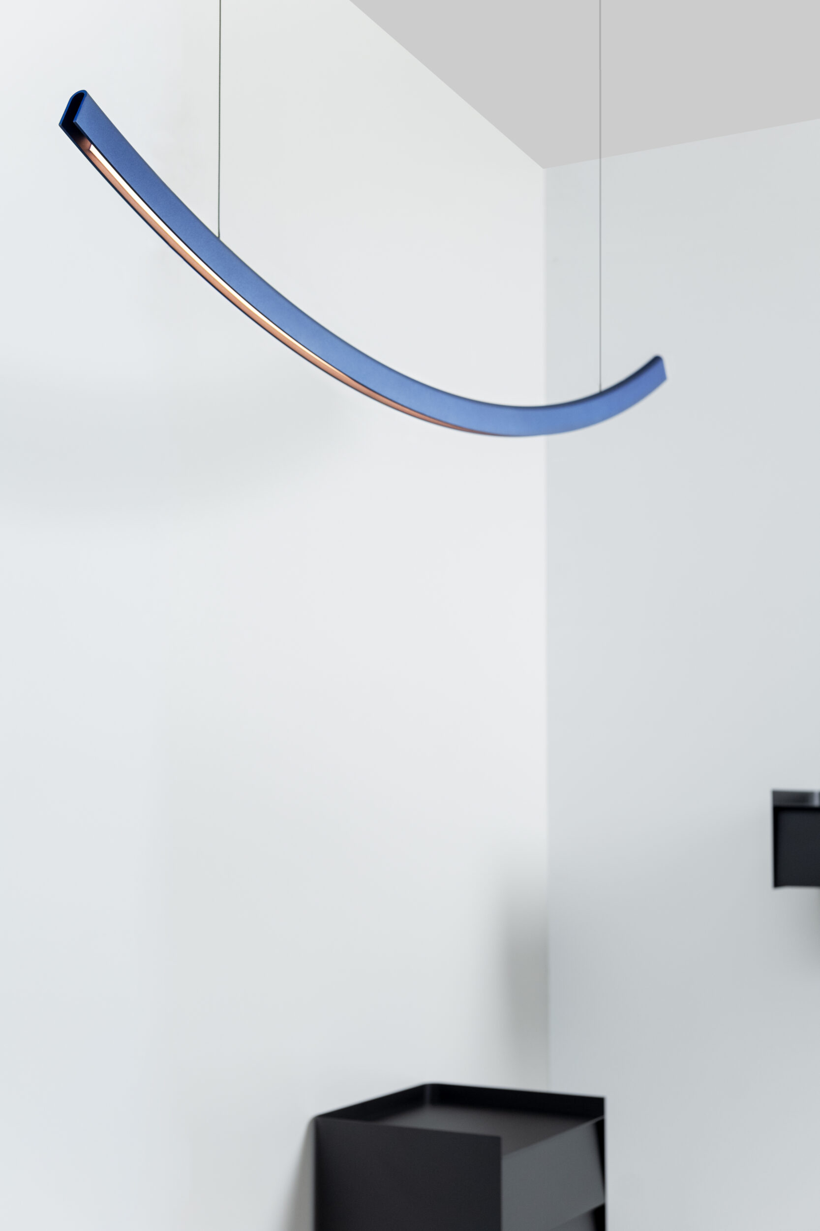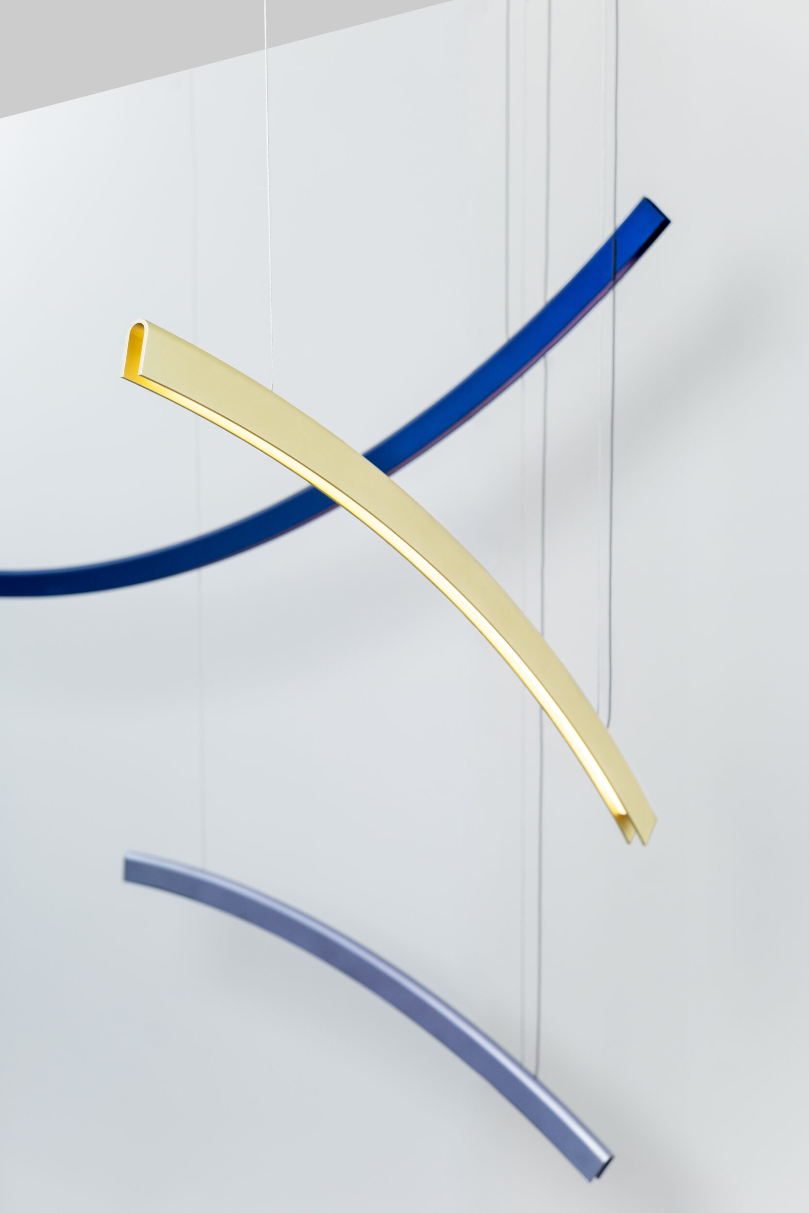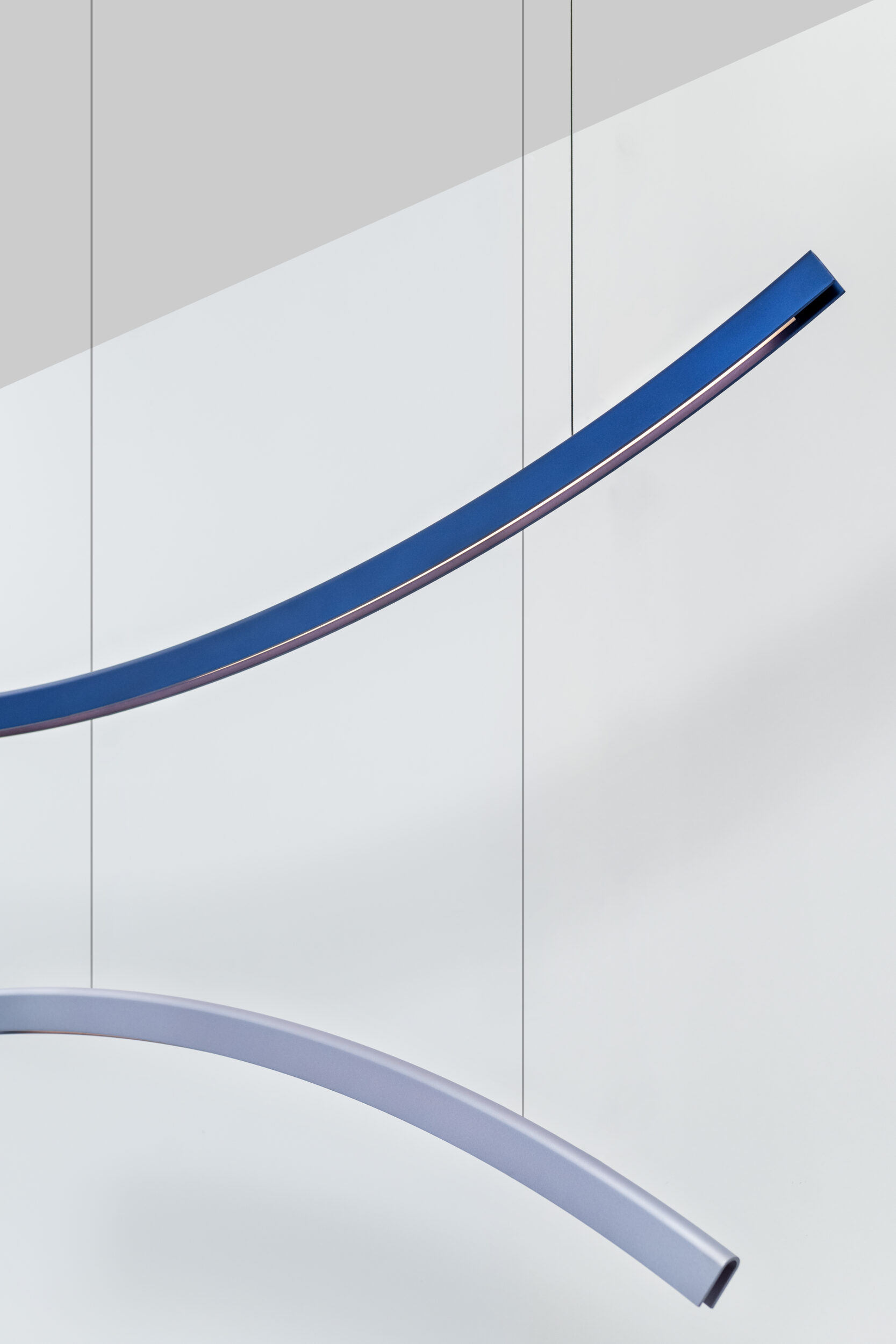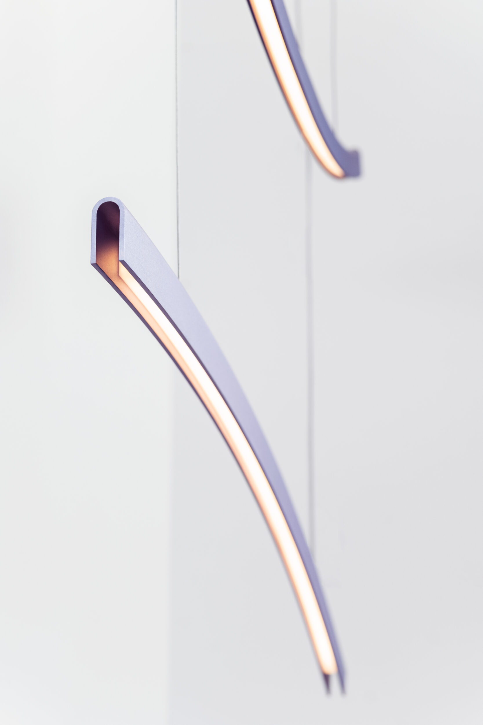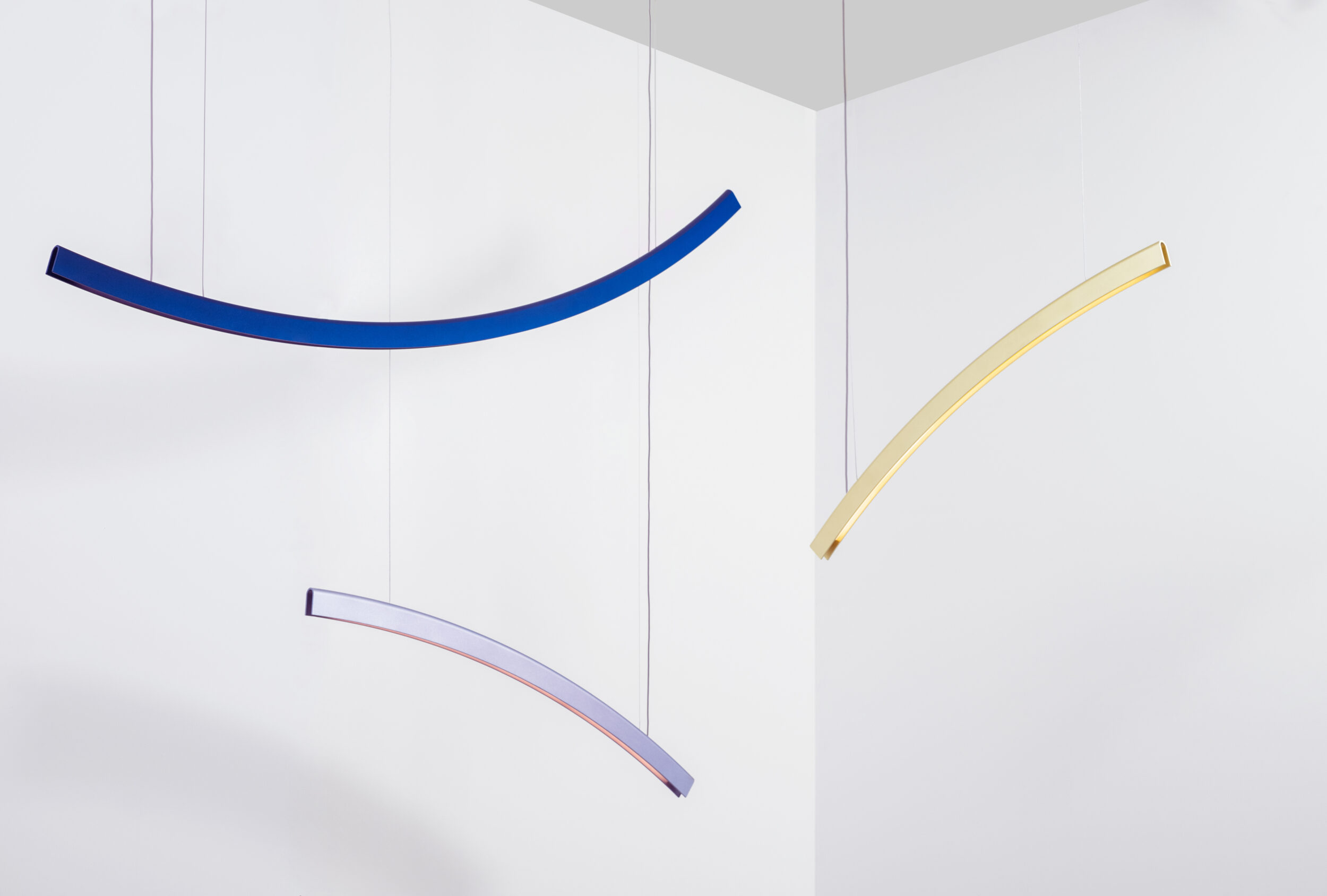 Bow is a collection of suspended lighting that encourages playful compositions. The curved forms are poised in the air, yet offer a sense of balance and movement. They can be used as singular elements in the home or office or grouped together to create dynamic installations. Produced from rolled aluminum profiles with an anodized finish.