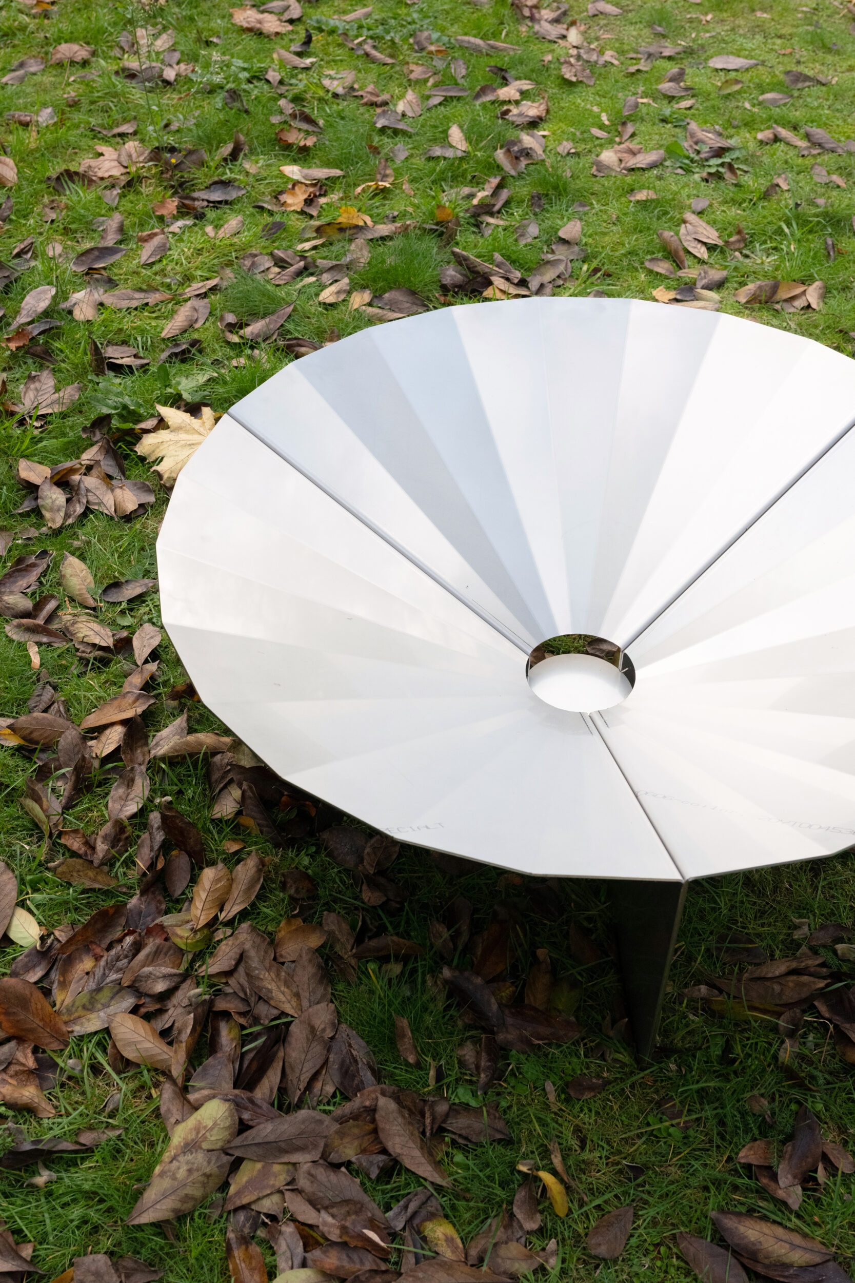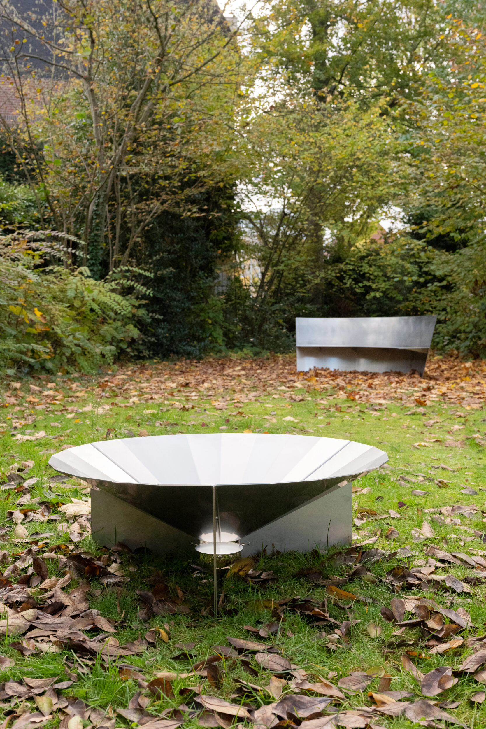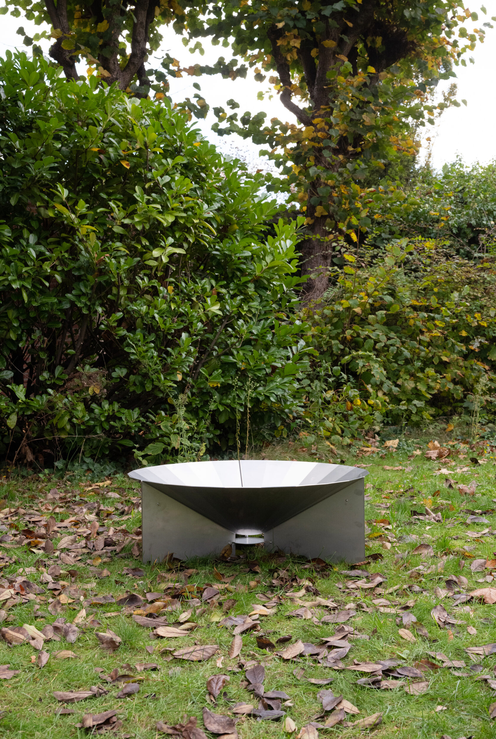 A minimal fire pit made from folded stainless steel. The wide, conical body directs heat and light upward. Designed for outdoor gatherings, the fire pit combines elemental function with a clean, modern silhouette.