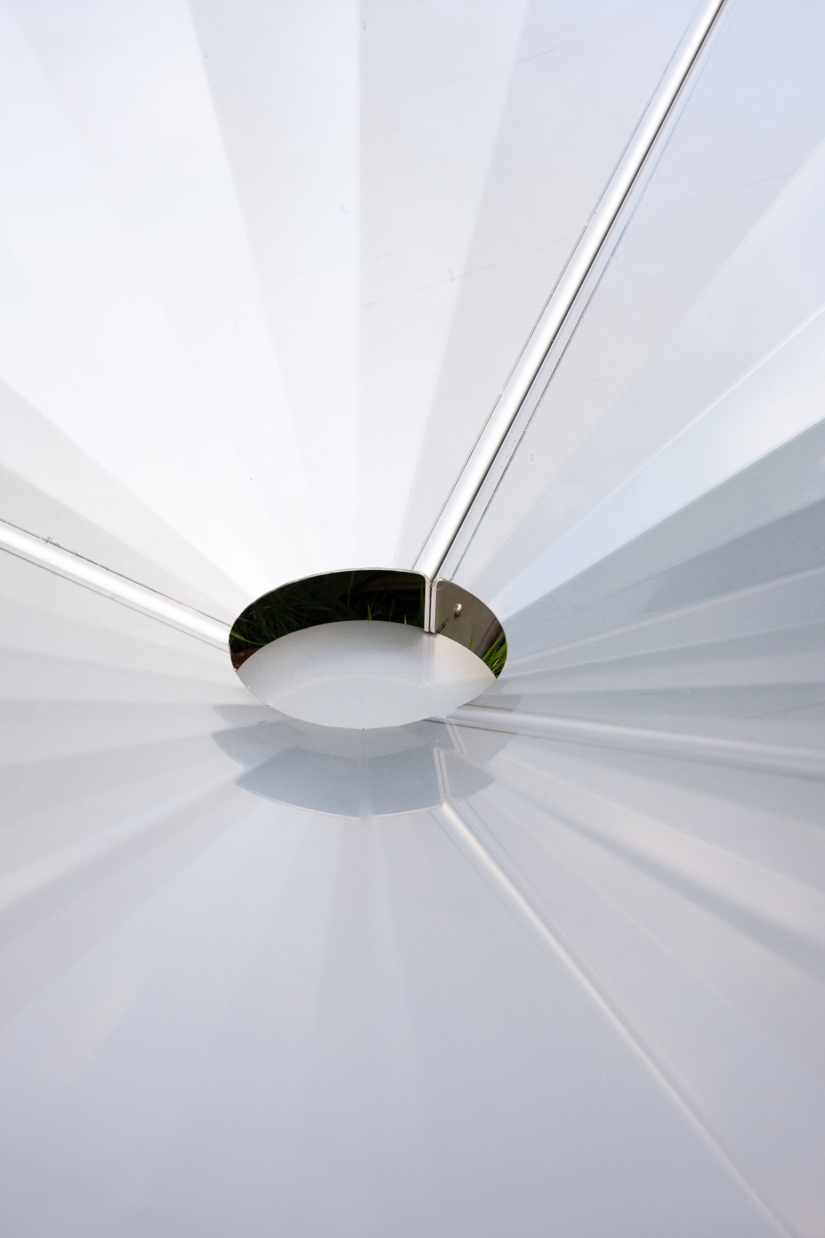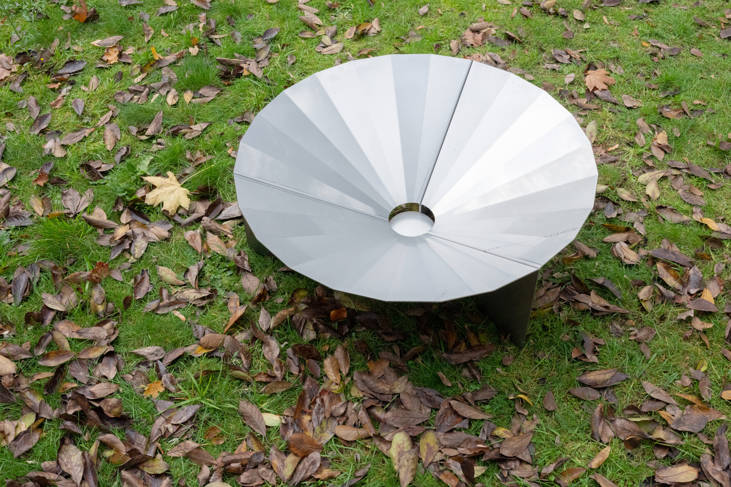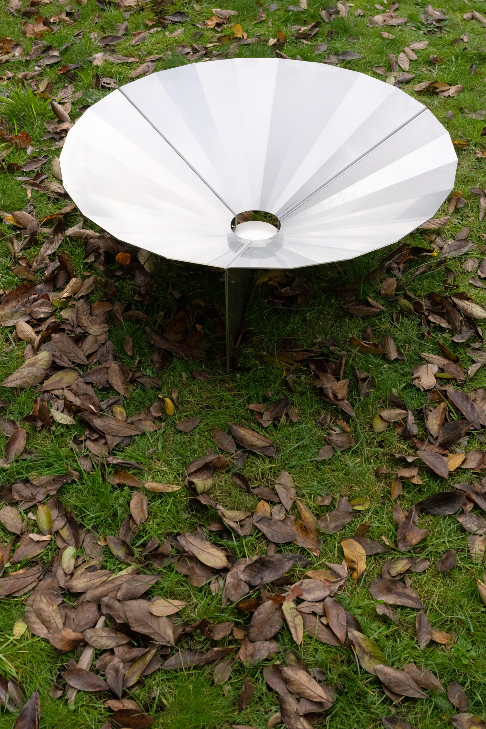 A minimal fire pit made from folded stainless steel. The wide, conical body directs heat and light upward. Designed for outdoor gatherings, the fire pit combines elemental function with a clean, modern silhouette.